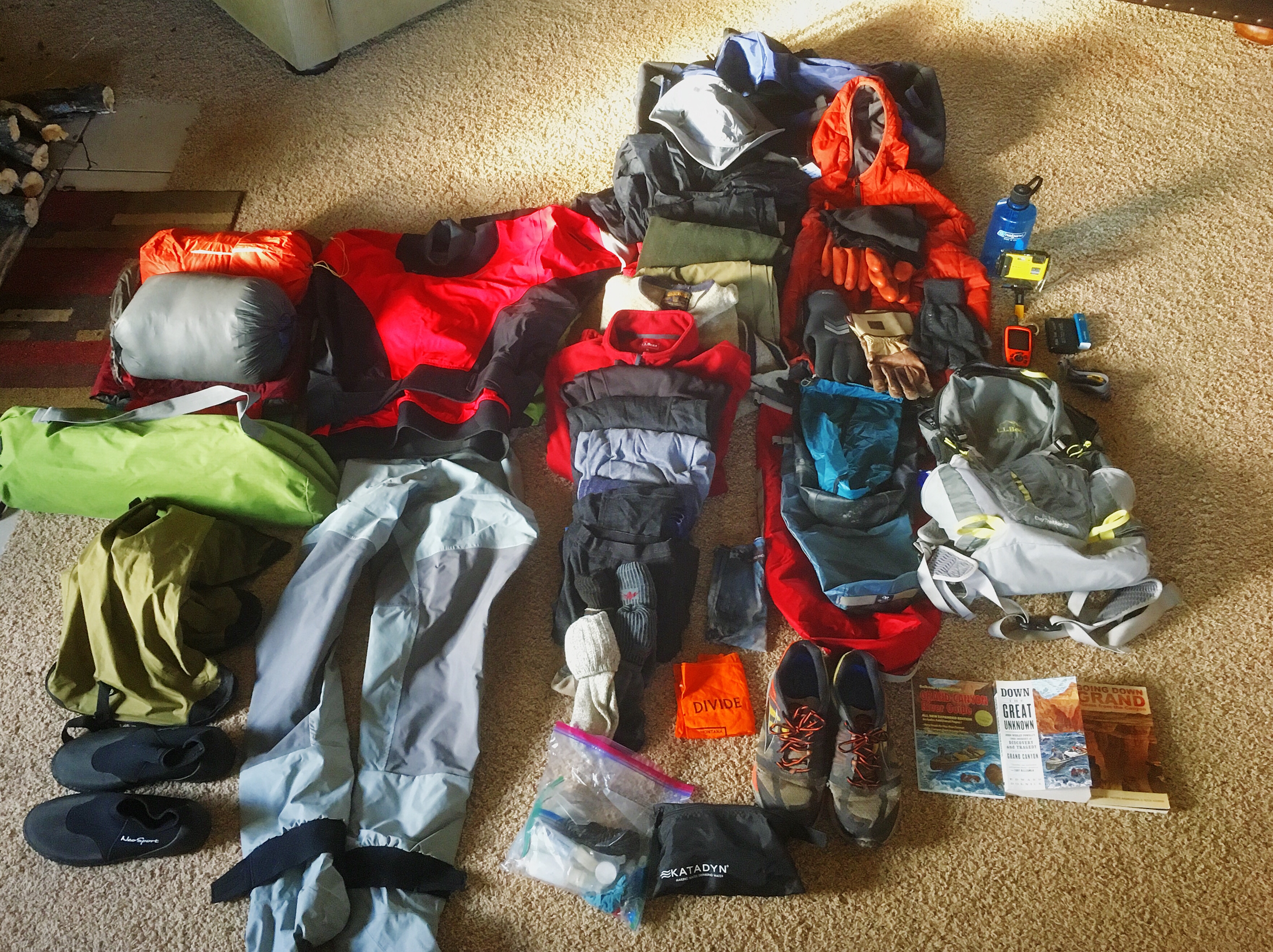 Dry bibs, dry jacket, neoprene booties, neoprene gloves, Neo overboots, and a wide brim sunhat.